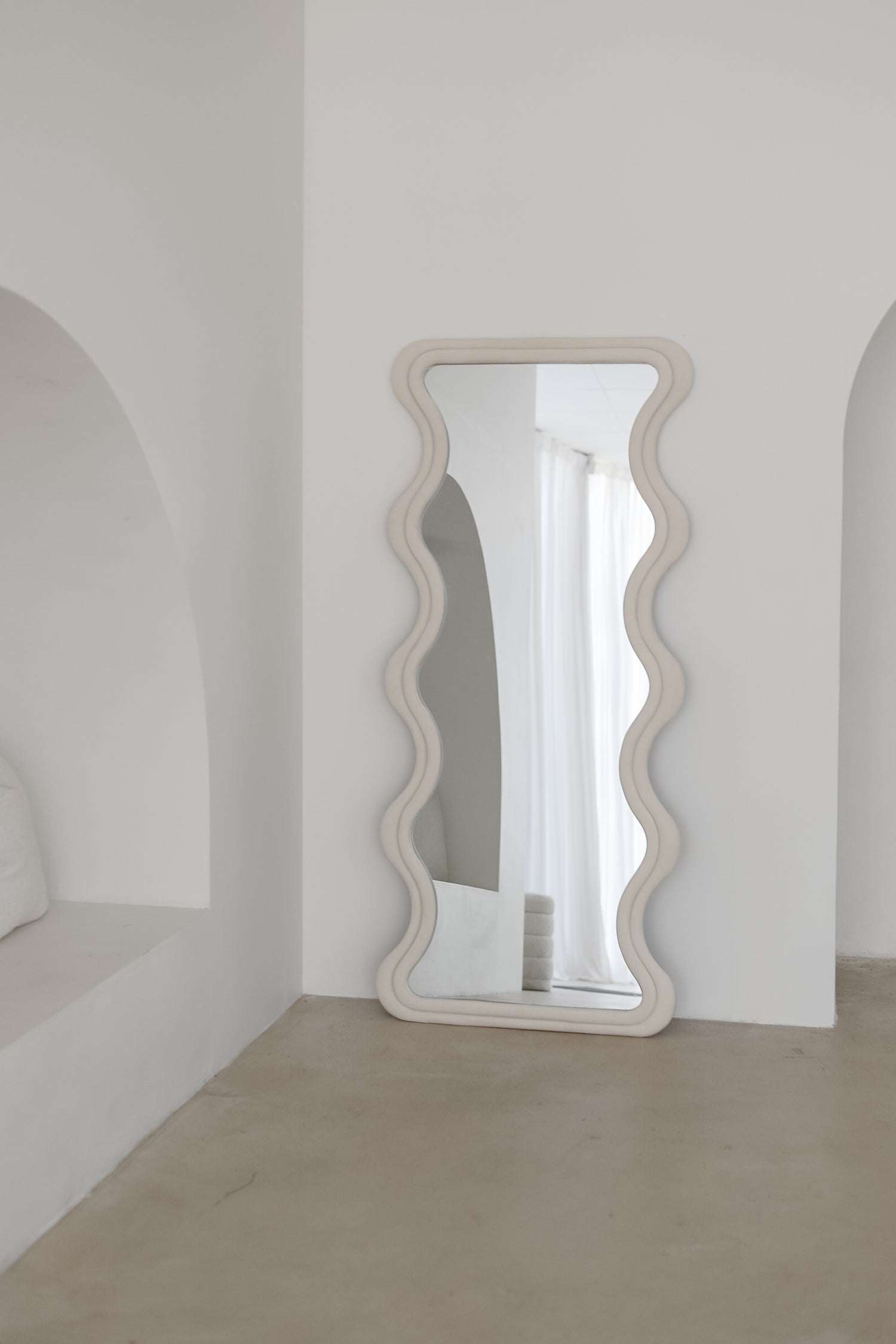 Eye-catching wavy mirror that adds personality to your space without taking over. Wrapped in soft, luxurious velvet, her timber frame brings a touch of elegance and style.